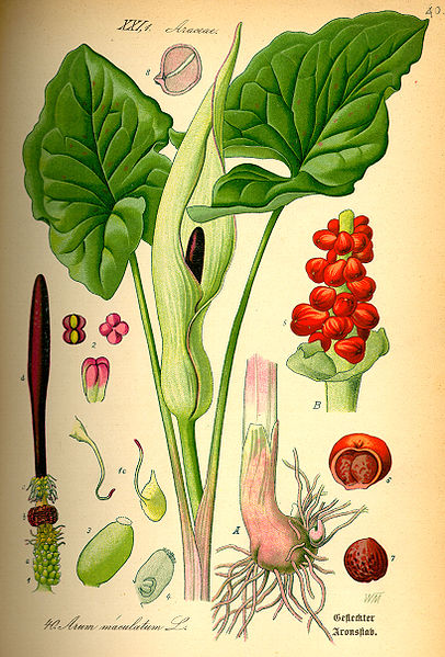 Bildmaterial Prof. Dr. Otto Wilhelm Thomé Flora von Deutschland, Österreich und der Schweiz 1885, Gera, Germany. Source: www.biolib.de. Diese Bild- oder Mediendatei ist gemeinfrei, weil ihre urheberrechtliche Schutzfrist abgelaufen ist. Dies gilt für die Europäische Union, die Vereinigten Staaten, Australien und alle weiteren Staaten mit einer gesetzlichen Schutzfrist von 70 Jahren nach dem Tod des Urhebers. http://de.wikipedia.org/w/index.php?title=Datei:Illustration_Arum_maculatum0.jpg&filetimestamp=20041030011614