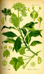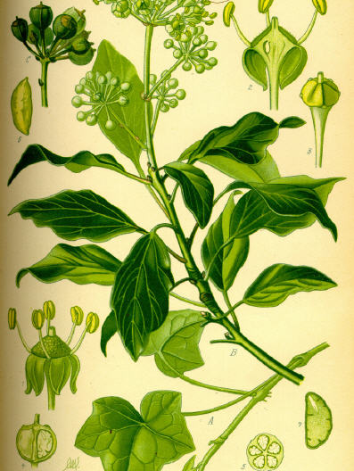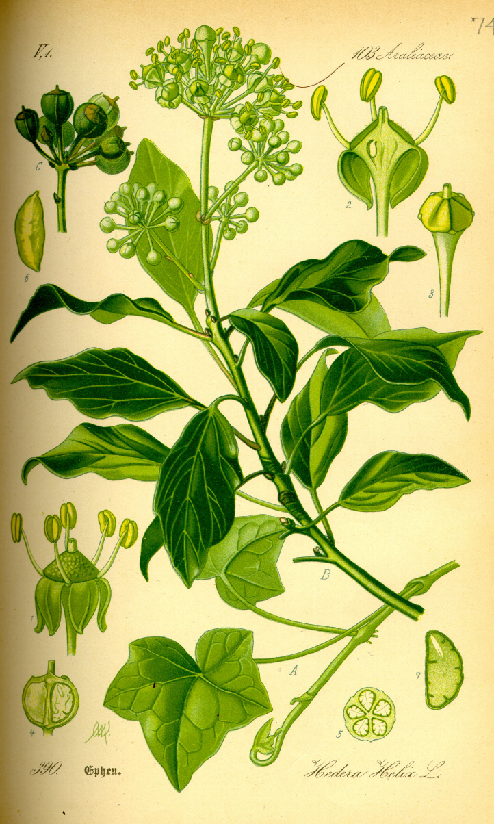 Synonyme: Bourreau des arbres (Frz.), Common Ivy (Engl.), Edera (It.), English Ivy (Engl.), Eppig, Grabefeu, Herbe à cautère (Frz.), Herbe de St-Jean (Frz.), Irish Ivy (Engl.), Joli bois (Frz.), Lierre commun (Frz.), Wintergrün